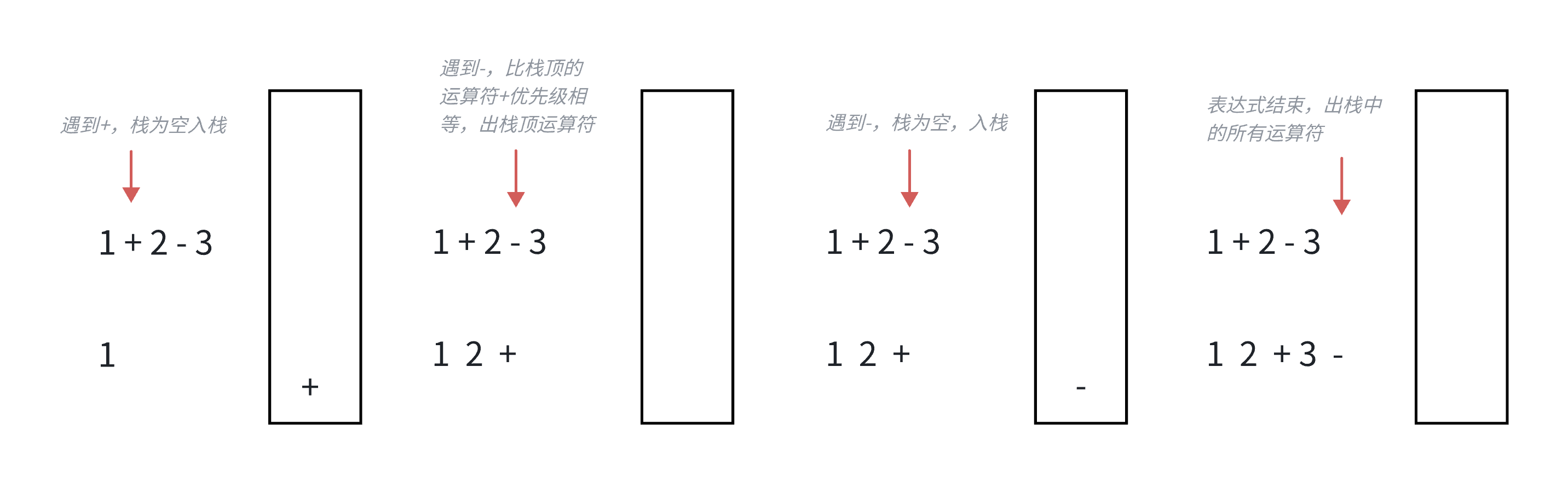 | 3 | [-, (] | 1 2 + 3 | 运算数,直接输出 |