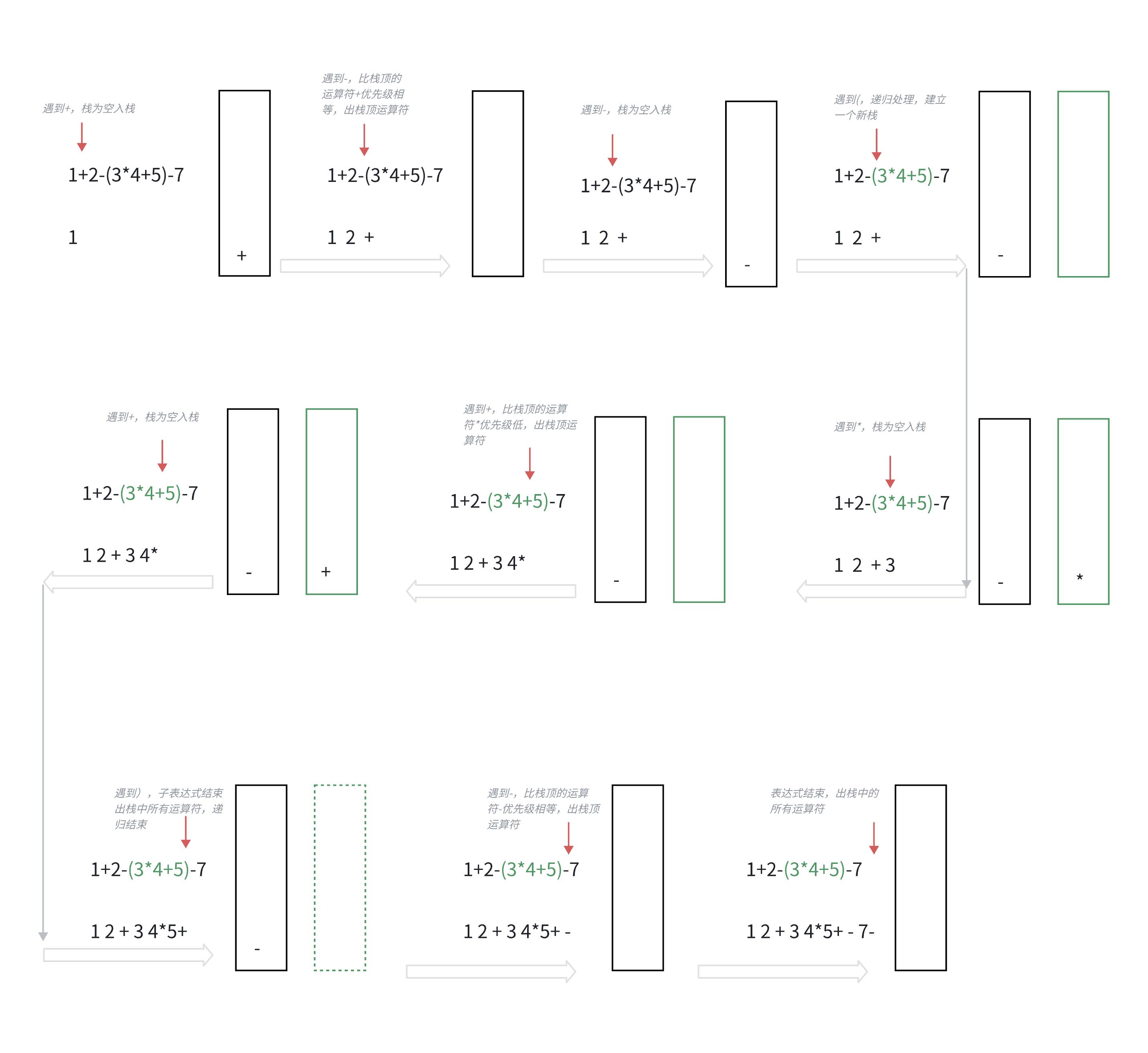 | - | [-] | 1 2 + 3 4 * 5 + - | -优先级等于栈顶-,弹出-输出,栈空后入栈- |