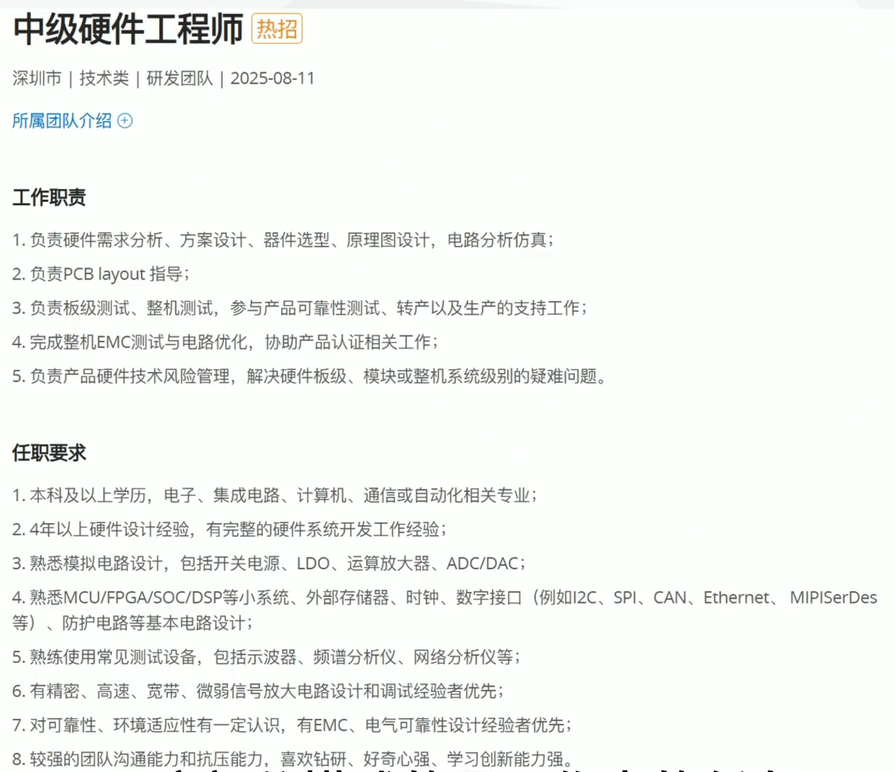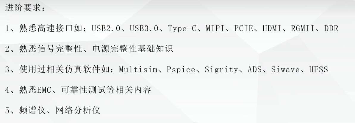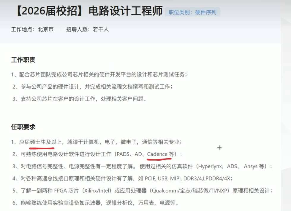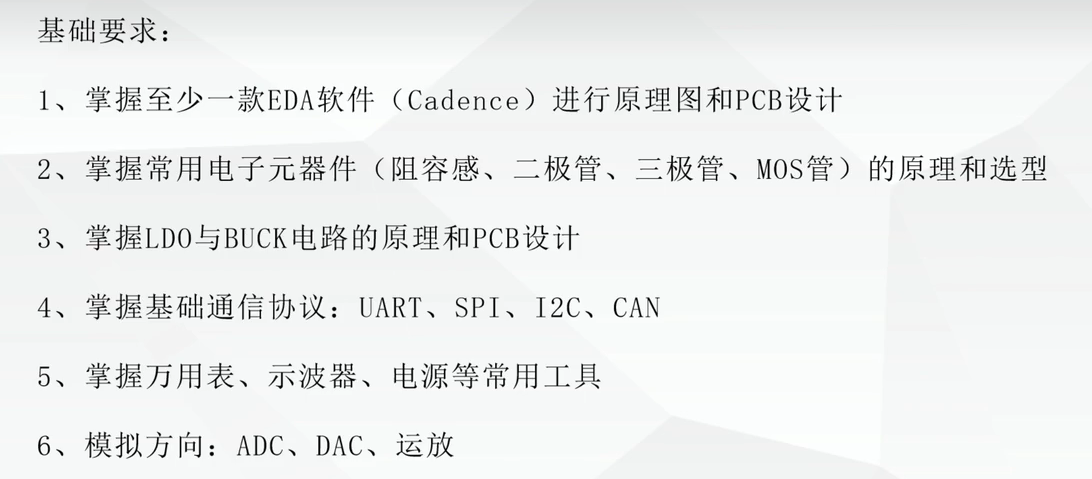 - 需要硬件需求分析、方案设计(项目实现什么功能,怎么做出来),器件选型(对常用器件要非常了解),原理图设计(重中之重),电路分析仿真(加分项)