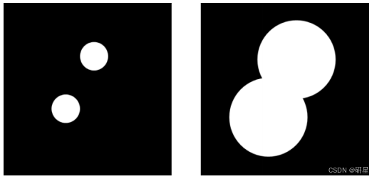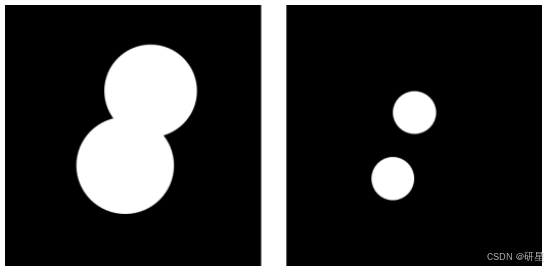 - 如果结构元完全处于前景图像中(左图),就将结构元中心点所对应的腐蚀结果图像中的像素点处理为前景色(白色,像素点的像素值为 1)。