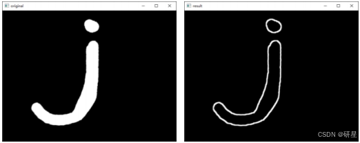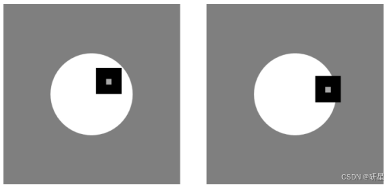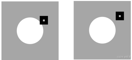 - 如果结构元未完全处于前景图像中(可能部分在,也可能完全不在,右图),就将结构元中心点对应的腐蚀结果图像中的像素点处理为背景色(黑色,像素点的像素值为 0)。