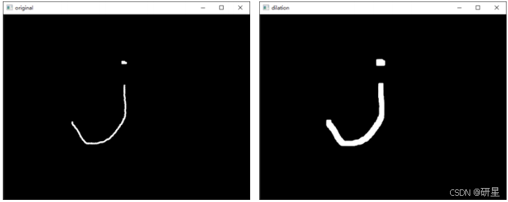 - 如果结构元中任意一点处于前景图像中,就将膨胀结果图像中对应像素点处理为前景色。