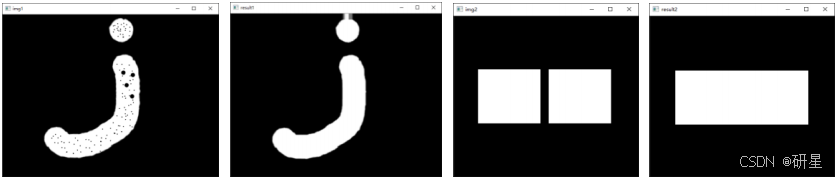 闭运算是先膨胀、后腐蚀的运算,它有助于关闭前景物体内部的小孔,或去除物体上的小黑点,还可以将不同的前景图像进行连接。