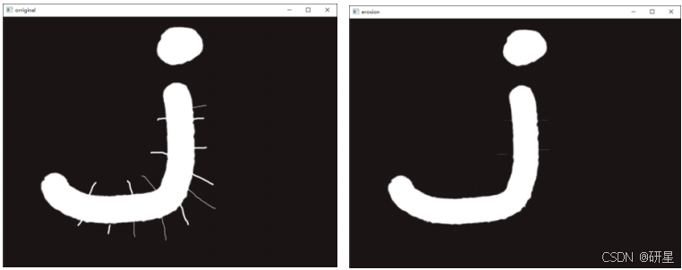用函数 cv2.erode()实现腐蚀操作,其语法格式为:
