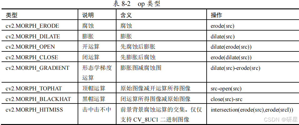 了函数 cv2.morphologyEx()来实现上述形态学运算,其语法结构如下: