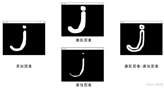 形态学梯度运算是用图像的膨胀图像减腐蚀图像的操作,该操作可以获取原始图像中前景图像的边缘。