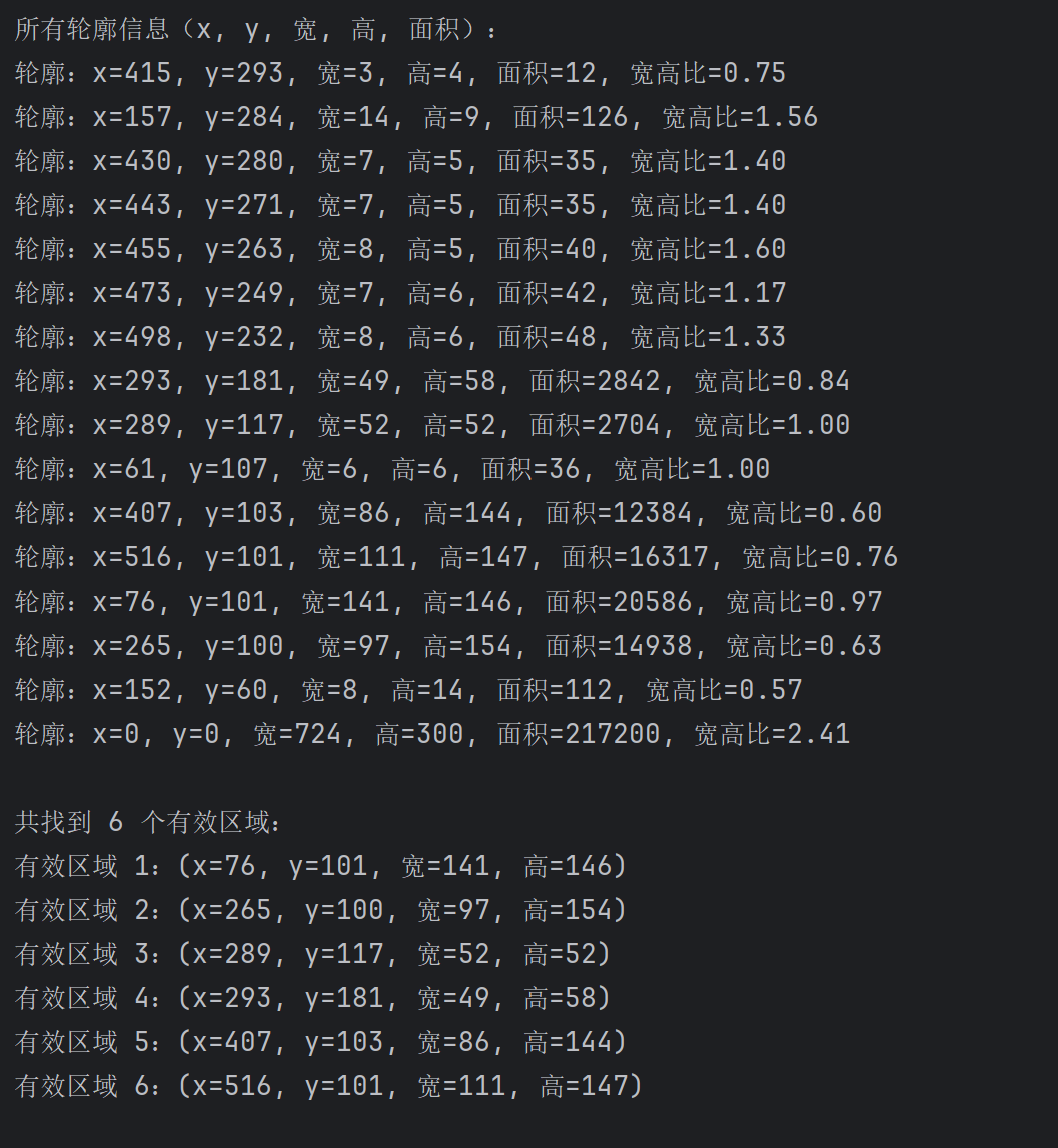 x/y坐标(左上角)、宽高、面积和宽高比,方便用户根据实际输出调整后续筛选条件(如某类验证码字符面积普遍为 500-1000,可据此优化面积阈值)。
