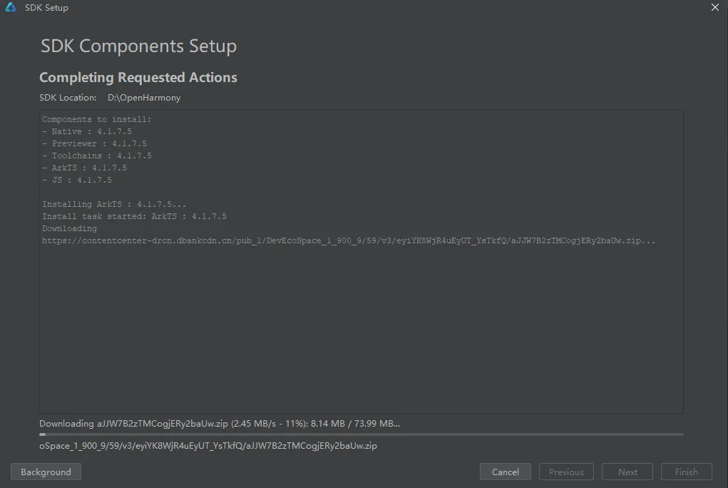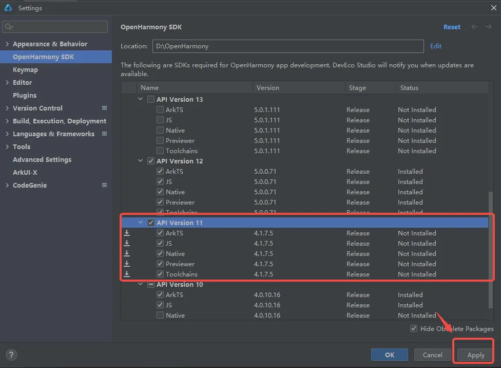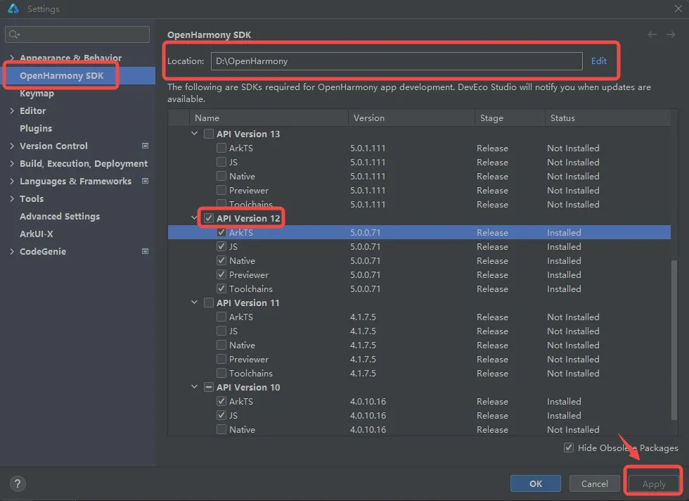 2)进入 Settings 窗口,选择 OpenHarmony SDK,选择 SDK 安装位置,然后勾选 API Version 12,下载关于 API Version 12 的所有相关内容,再点击【Apply】进行下载。