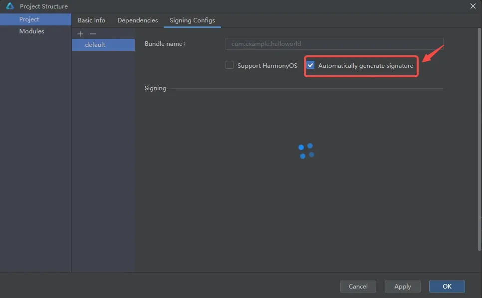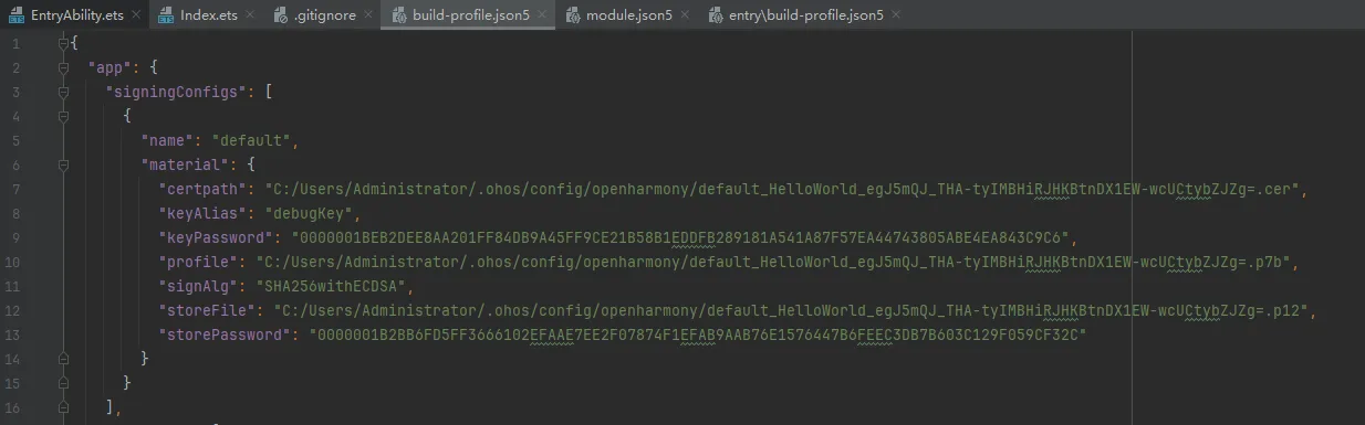 如下图出现签名信息后,点击 OK,签名内容signingConfigs会被写入工程级build-profile.json5中。