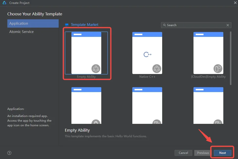 3)选择 Application 应用开发(本文以应用开发为例,Atomic Service 对应为原子化服务开发),选择模板 "Empty Ability",点击 Next 进行下一步配置