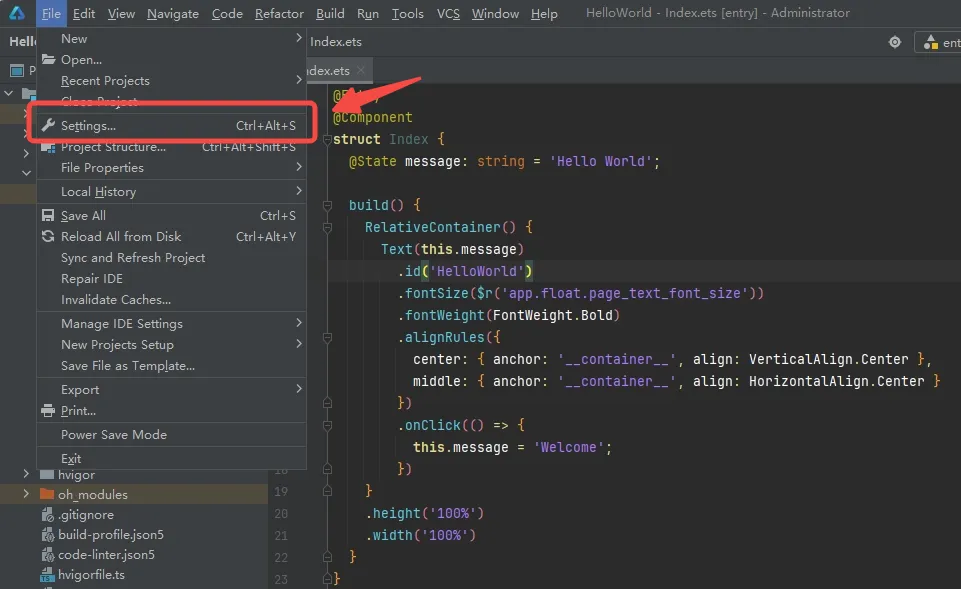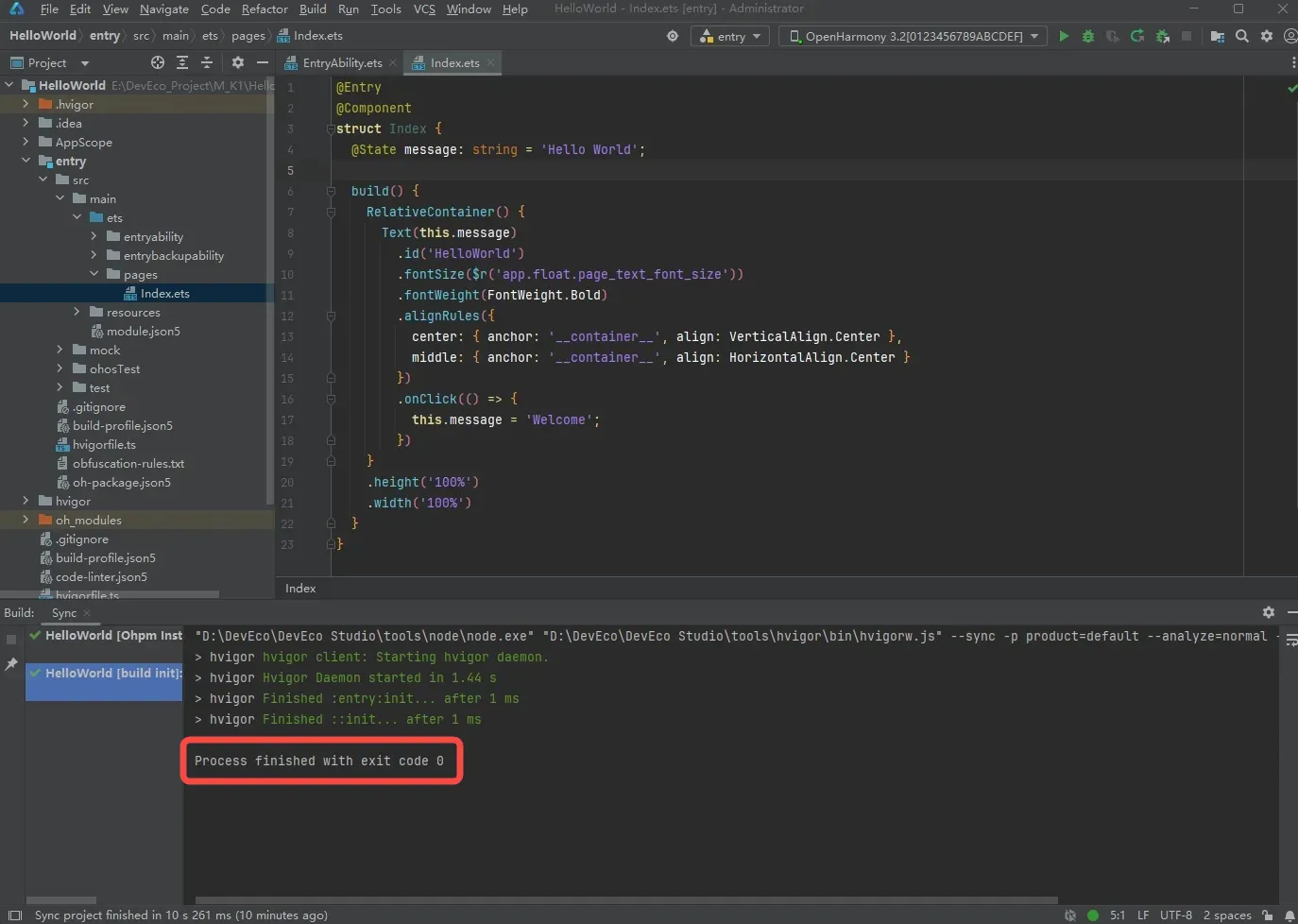 工程同步完成后,在 "Project" 窗口,点击 "entry > src > main > ets > pages" ,打开 "Index.ets" 文件,可以看到应用工程的默认程序页面由 Text 组件组成。 该应用实现的功能为:点击 Hello World 文本组件就会切换为 Welcome。 "Index.ets" 文件的示例如下: