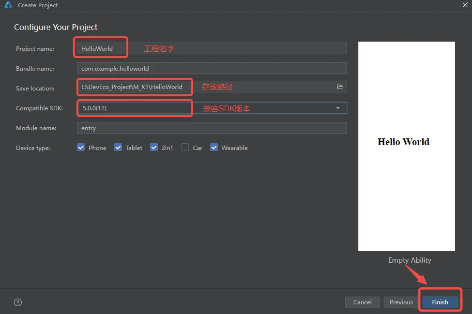 4)进入配置工程界面,修改一下工程存放路径,工程名字,和兼容 SDK 版本,其他参数保持默认设置即可,点击 Finish 创建工程 注意:M4-R1 开发板的板端 API 版本为 API 12,故 Compatible SDK 选择 5.0.0(12)