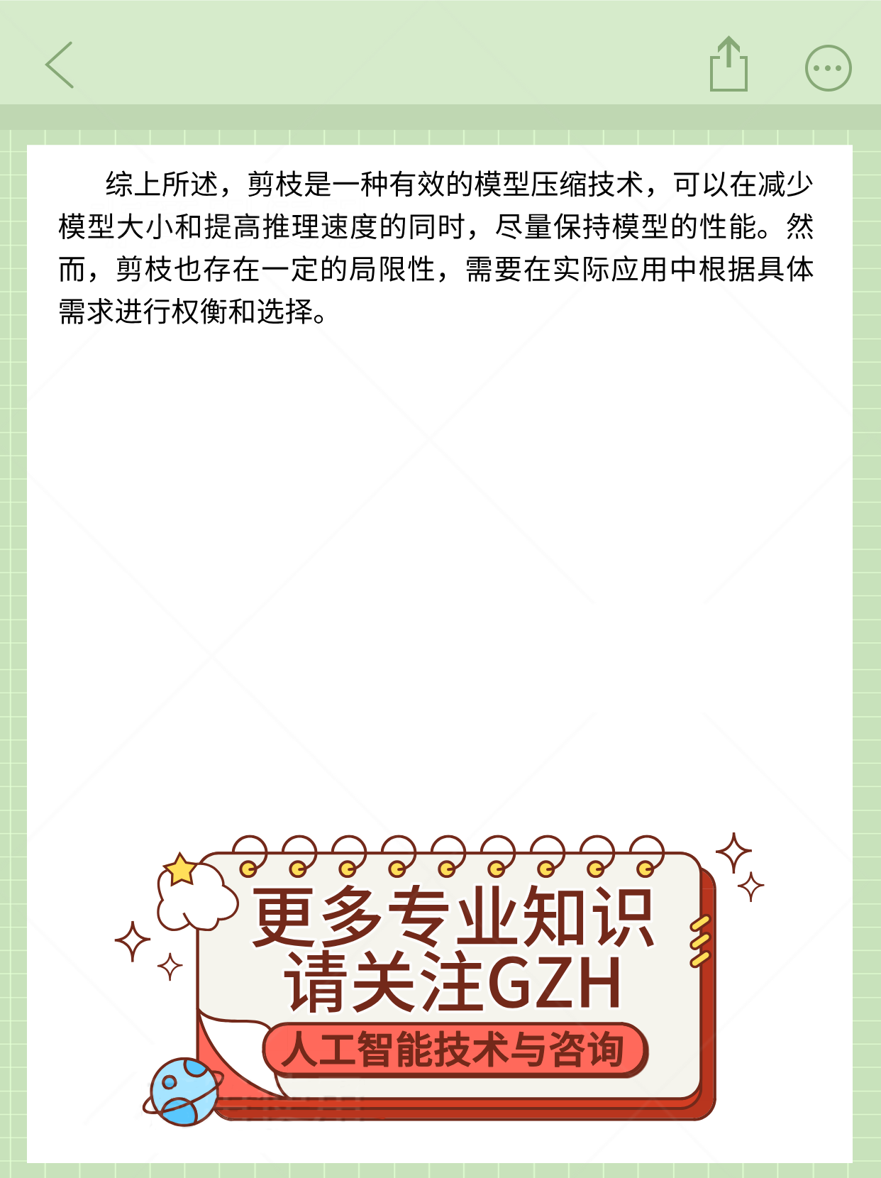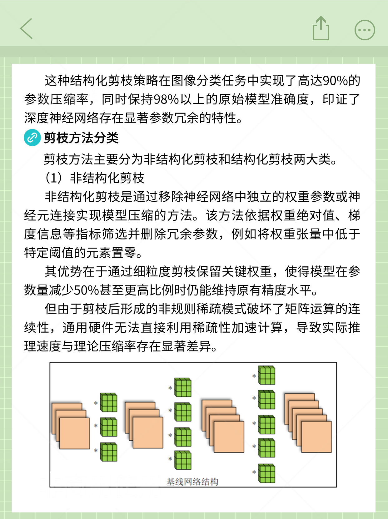 大模型-模型压缩:量化、剪枝、蒸馏、二值化 (3)一、模型压缩概述1.模型压缩的必要性2.模型压缩的目标二、量化1.量化原理2.量化方法分类3.量化的优势与局限三、剪枝1.剪枝原理2.剪枝方法分类3.剪枝的优势与局限四、蒸馏1.蒸馏原理2.蒸馏方法流程3.蒸馏的优势与局限五、二值化1.二值化原理2.二值化方法应用3.二值化的优缺点