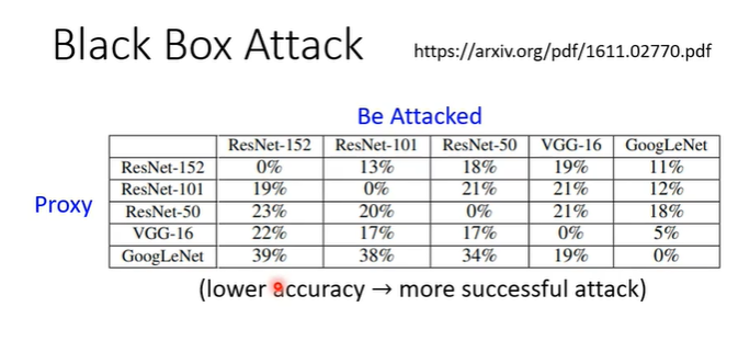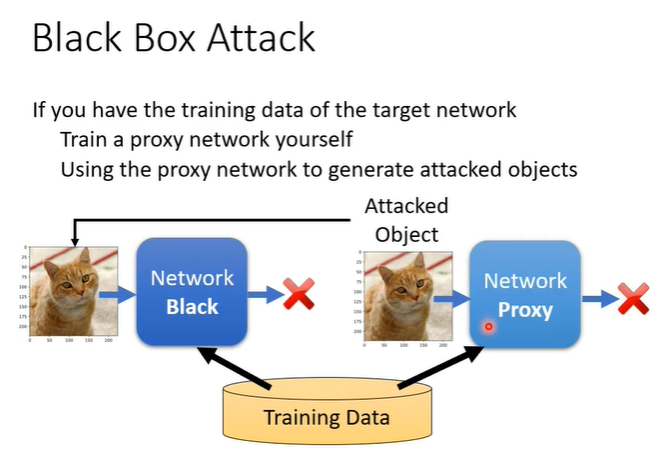知道模型参数的叫做白箱攻击,不知道模型参数的叫做黑箱攻击。黑箱攻击如何实现?假设知道是用什么资料训练的,我们就可以训练一个proxy network去模拟我们要攻击的对象,可以成功攻击proxy network也许就能攻击我们不知到的black network。