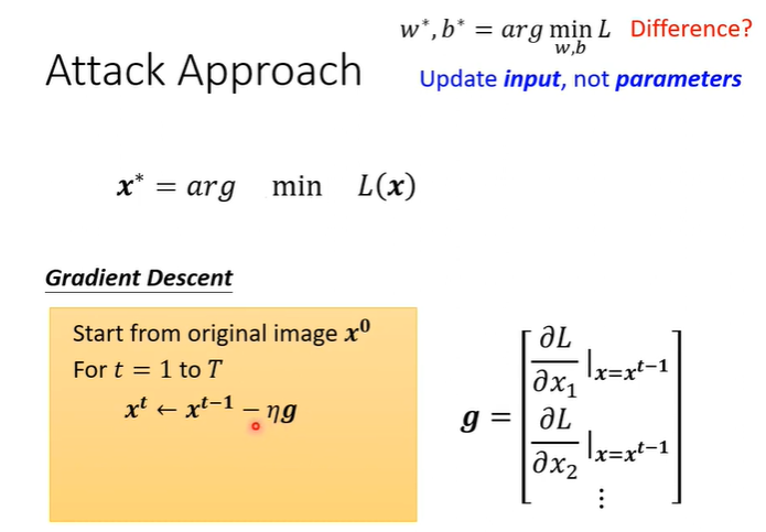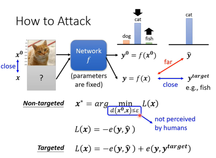 输入是一张图片X0,network是一个function称为f,输出是一个distribution成为value。假设network参数是固定的,我们要找出无目标攻击的杂讯,需要一张新的图片X,作为输入时它的输出为y,我们希望y与正确答案的差距越大越好。定义一个loss function为L,L是y与正确答案的差距取一个负号,这样得到最小的L就是y与正确答案的差距最大值。如果是有目标的攻击,就不仅需要y与正确答案的差距越大越好,还需要y与目标答案越近越好,此时的L就可以写为y与正确答案的差距的负值与y与目标答案的差距相加。