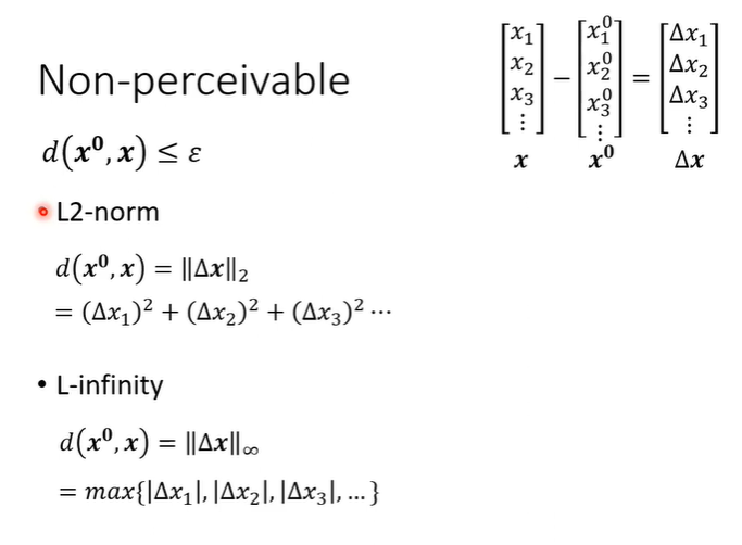除此之外还有一个限制,就是X与X0之间的差距要小到人眼无法察觉。如何计算两张图片的差距呢?两张图片都视为一个很长的向量,X与X0相减得到。一种L2-norm是将