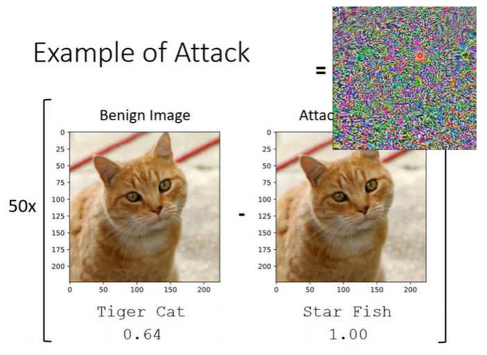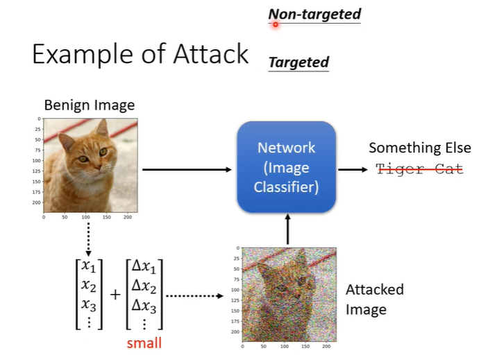 在实际应用中,network不仅仅需要正确率高,还需要能够应付人类故意骗过network的行为。举一个例子,我们有一个影像辨识系统,给他一张照片begin image,可以告诉我们这张照片属于什么类别,下图示例中begin image属于猫的类别。现在我们在照片上加入非常小的杂讯,即一张照片可以看作是一个非常长的向量,我们在向量的每一个维度上加入一点小小的杂讯。加入杂讯的照片(attacked image)一般用肉眼无法辨别,我们期待attacked image丢入network输出不是猫。攻击可以分为两种攻击,一种是无目标攻击,只要让network输出不是猫就算成功。