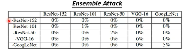 另一种攻击方法成功率更高,行代表被攻击的模型,列代表5个模型中被去除的模型,即对角线为黑箱攻击。不难看出,当一个image可以同时骗过多个network时,骗过一个不知道参数的黑箱network也很容易成功。
