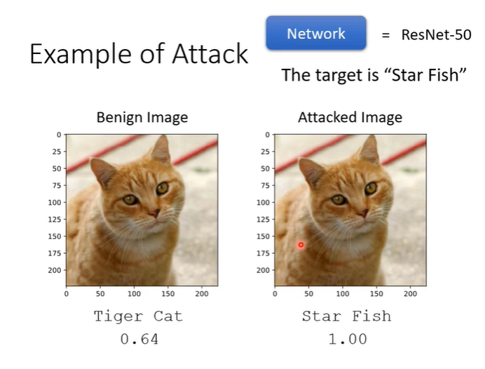 另一种更困难的攻击是有目标的攻击,此时我们需要network输出不是猫而是别的东西,比如说加入杂讯后希望network输出海星,把猫误判为海星才算成功。在一个50层的ResNet中,输入begin image,输出是tiger cat,信心分数为0.64。在加入杂讯后在让ResNet判断,输出是Star Fish,且信心分数为1。