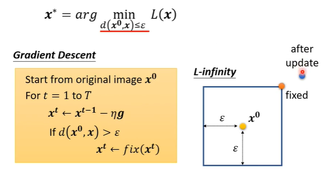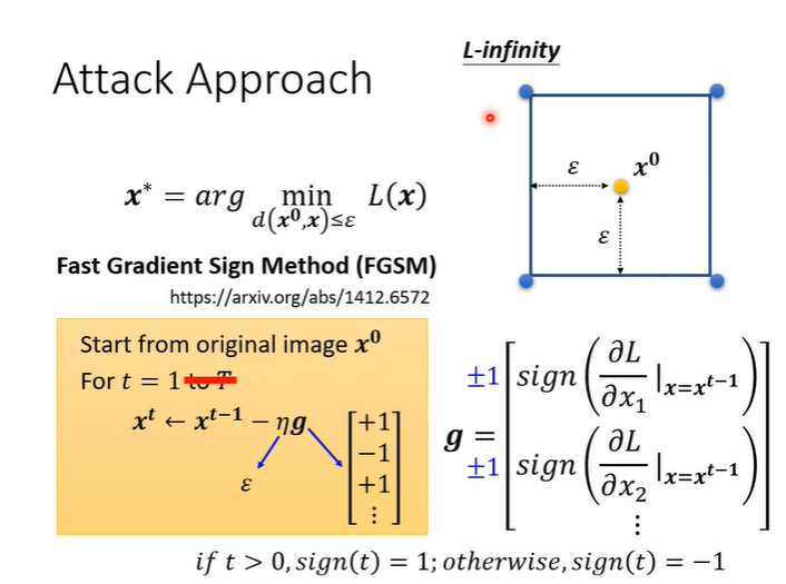 FGSM是一种最简单的attack的方法,它只更新一次。在g这边做了一个特别的设计,它不直接使用gradient descent的值而是取一个sign,sign()的意思是如果括号内的值小于0就输出-1,括号内的值大于0就输出1,最后得到的效果就是,一定会落在蓝色方框内的四个角落。