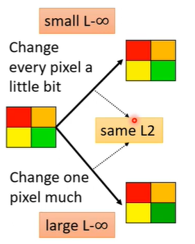 对于人类的感知来说,我们选择L-infinity更好。举一个例子,下图中的四色方块,一个是四个颜色都做了一点微小的改变,一个是集中改变绿色的小块,他们的L2-norm是相同的,但是集中改变颜色的L-infinity更大,从这个例子中L-infinity更接近人类的感知,更适合做攻击。