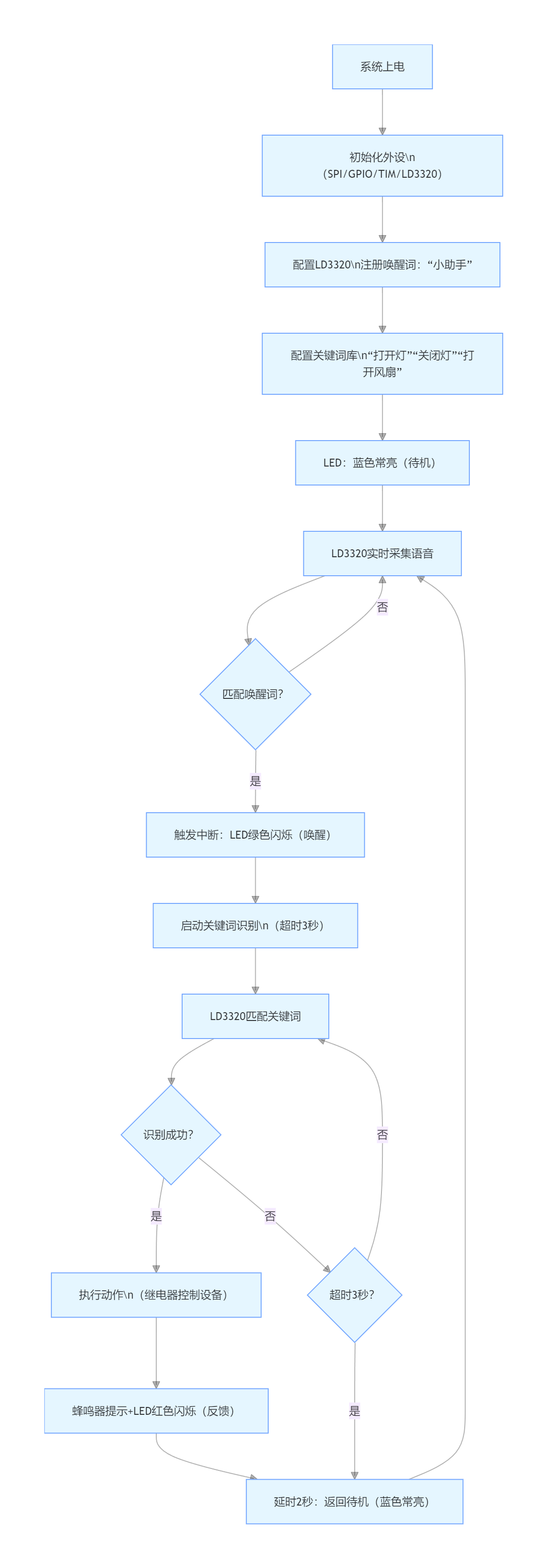 void LD3320_RegisterWords(void) {// 注册唤醒词:"小助手"(唤醒词需优先注册)LD3320_AddWakeUpWord("小助手", 0); // 0为唤醒词固定ID// 注册关键词(最多50个,ID从1开始)LD3320_AddKeyWord(KW_OPEN_LIGHT, "打开灯");LD3320_AddKeyWord(KW_CLOSE_LIGHT, "关闭灯");LD3320_AddKeyWord(KW_OPEN_FAN, "打开风扇");