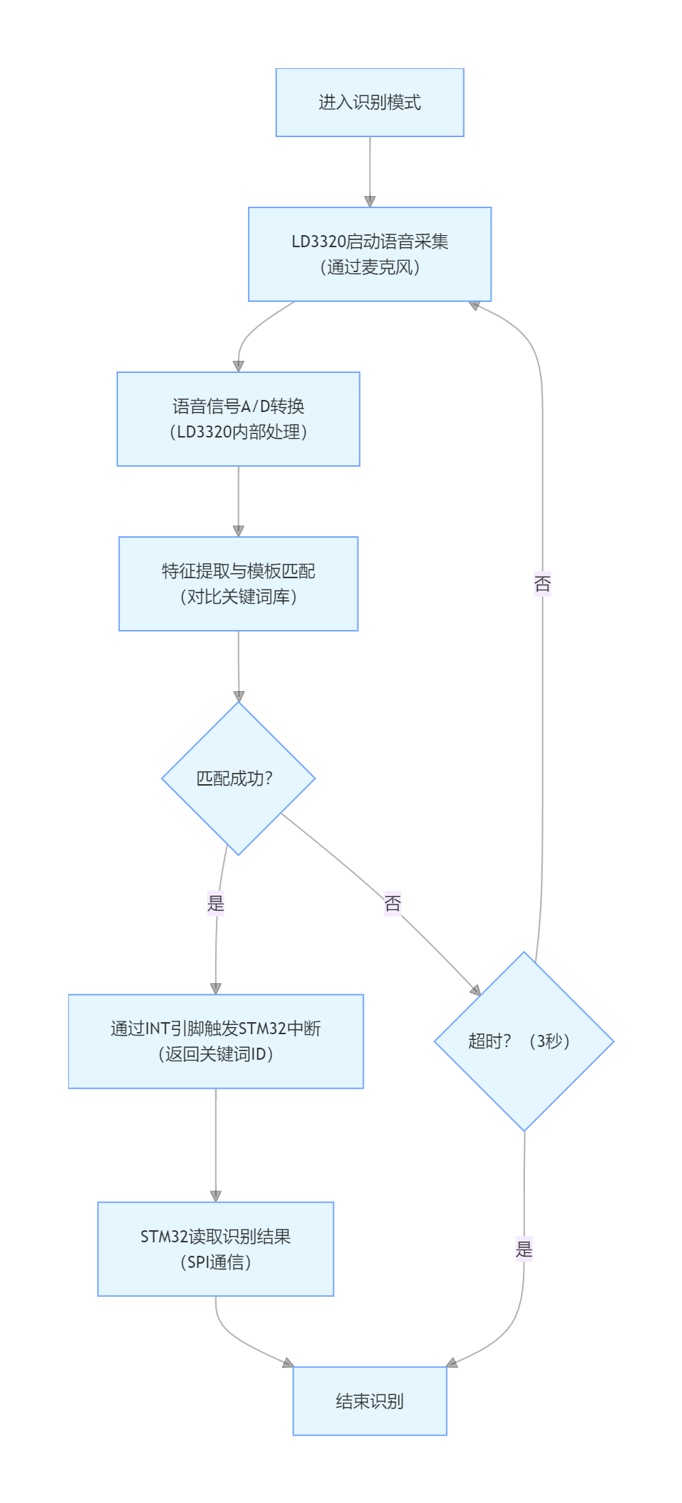 void EXTI1_IRQHandler(void) {if (EXTI_GetITStatus(EXTI_Line1) != RESET) {// 读取LD3320识别结果(SPI通信)kw_id = LD3320_ReadResult();if (kw_id == 0) {wakeup_flag = 1; // 唤醒词识别成功} else {// 关键词识别成功(kw_id为1~3)wakeup_flag = 2;}EXTI_ClearITPendingBit(EXTI_Line1);}