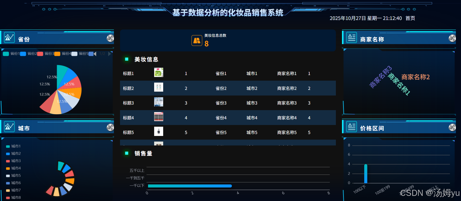 在数据科学蓬勃发展的当下,基于Python开发化妆品销售分析系统具有重要的理论价值。Python凭借其开源特性与丰富的数据处理库,如Pandas、Scikit - learn等,为销售数据分析提供了强大的工具支持。通过构建该系统,能够深入探索如何运用Python技术对化妆品销售领域中复杂、多元的数据进行有效整合与深度分析。这不仅丰富了数据处理理论在特定行业的应用案例,还能进一步完善销售数据分析的理论框架,为后续相关研究提供可借鉴的方法和模型。同时,该系统的研究有助于推动跨学科理论融合。它结合了计算机科学中的编程技术、数据分析算法与市场营销学中的销售理论、消费者行为学知识。通过实践应用,能够检验和优化不同学科理论在化妆品销售场景中的适用性,促进学科间的交流与协同发展,为跨学科研究提供新的思路和方向。从企业层面来看,该系统能助力化妆品企业实现精准决策。通过对销售数据的实时监测和深度分析,企业可以准确把握市场动态、消费者需求变化以及产品销售趋势,从而制定出更具针对性的营销策略、优化产品组合和库存管理,提高运营效率和经济效益。对于消费者而言,系统分析结果可为企业提供改进产品和服务质量的依据,使消费者能够获得更符合自身需求的高品质化妆品和更优质的购物体验。从行业发展的角度,该系统的推广应用有助于推动化妆品行业的数字化转型,提升整个行业的信息化水平和竞争力,促进化妆品市场的健康、可持续发展。