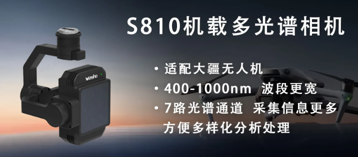 多光谱相机:S810机载多光谱相机,7条光谱通道和1条RGB通道,实时图传,支持光谱标定、辐射标定、照度校正、畸变校正。