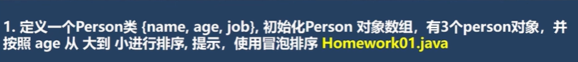package oop_Homework;public class Homework01 {public static void main(String[] args) {Person[] persons = new Person[3];//初始化Person对象数组,有三个person对象persons[0] = new Person("smith",10,"java工程师");persons[1] = new Person("tom",50,"大数据工程师");persons[2] = new Person("mary",30,"PHP工程师");//输出对象数组for (int i = 0; i < persons.length; i++) {System.out.println(persons[i]);//默认对象的。tostring(),方法已经重写 tostring 已经重写输出对象的属性}System.out.println("========冒泡排序后========");Person tmp = null;//临时变量,用于交换数据for (int i = 0; i < persons.length - 1; i++) {for (int j = 0; j < persons.length - i; j++) {//按照 age 从大到小 进行排序,如果 前面人的 age 小于后面人的年龄 就交换if (persons[i].getName().length() > persons[i + 1].getName().length()){tmp = persons[i + 1];persons[i + 1] = persons[i];persons[i] = tmp;}}}for (int i = 0; i < persons.length; i++) {System.out.println(persons[i]);//默认对象的。tostring(),方法已经重写 tostring 已经重写输出对象的属性}}