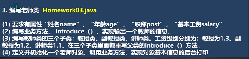 package oop_Homework.Homework03;public class Homework03 {public static void main(String[] args) {Professor professor = new Professor("老高",50,"高级职称",12000,1.3);a_Professor aProfessor = new a_Professor("老中", 49, "中级职称", 11000, 1.2);Lectuer lectuer = new Lectuer("老讲", 48, "初级职称", 10000, 1.1);professor.introduce();aProfessor.introduce();lectuer.introduce();}