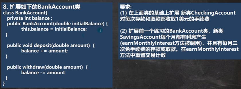 package Homework08;public class CheckingAccount extends BankAccount{public CheckingAccount(double initialBalance) {super(initialBalance);}@Overridepublic void deposit(double amount) {super.deposit(amount - 1);}@Overridepublic void withdraw(double amount) {super.withdraw(amount + 1);}