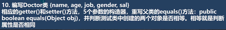 package Homework10;public class Doctor {private String name;private int age;private String job;private char gender;private double sal;public Doctor(String name, int age, String job, char gender, double sal) {this.name = name;this.age = age;this.job = job;this.gender = gender;this.sal = sal;}public String getName() {return name;}public void setName(String name) {this.name = name;}public int getAge() {return age;}public void setAge(int age) {this.age = age;}public String getJob() {return job;}public void setJob(String job) {this.job = job;}public char getGender() {return gender;}public void setGender(char gender) {this.gender = gender;}public double getSal() {return sal;}public void setSal(double sal) {this.sal = sal;}public boolean equals(Object obj){if (this == obj){return true;}if (!(obj instanceof Doctor)){return false;}//向下转型,因为obj的运行类型是Doctor或者是其子类型Doctor doctor = (Doctor)obj;return this.name.equals(doctor.name) && this.age == doctor.age && this.gender == doctor.gender && this.job.equals(doctor.job) && this.sal == doctor.sal;}