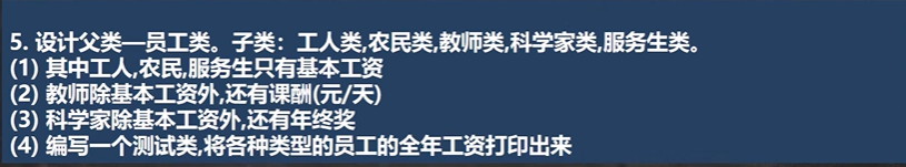 package Homework05;import com.sun.deploy.util.Waiter;public class Homework05 {public static void main(String[] args) {Peasant peasant = new Peasant("johe", "农民", 4500);peasant.yearsal();Worker worker = new Worker("sam", "工人", 4000);worker.yearsal();Teacher teacher = new Teacher("chuanpu", "教师", 4000, 25, 100);teacher.yearsal();Scientist scientist = new Scientist("tagna", "科学家", 5000, 10000);scientist.yearsal();}