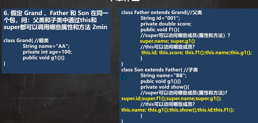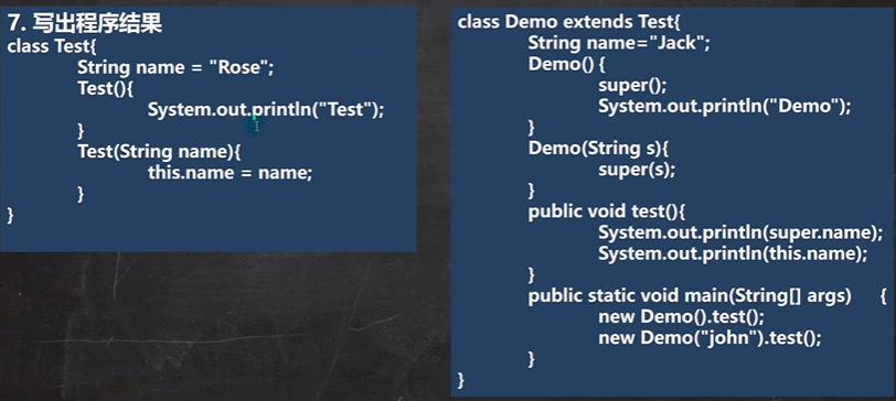 class Demo extends Test{String name = "Jack";Demo(){super();System.out.println("Demo");}Demo(String s){super(s);}public void test(){System.out.println(super.name);System.out.println(this.name);}public static void main(String[] args) {new Demo().test();new Demo("john").test();}