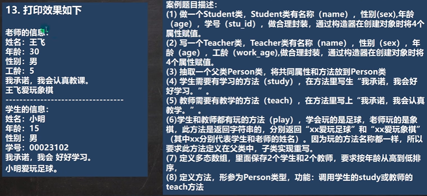 package Homework12;public class Student extends Person{private String stu_id;public Student(String name, char sex, int age, String stu_id) {super(name,sex,age);this.stu_id = stu_id;}public String getStu_id() {return stu_id;}public void setStu_id(String stu_id) {this.stu_id = stu_id;}//我承诺会好好学习 javapublic void study(){System.out.println(getName() + "我承诺会好好学习 java");}//学生爱玩@Overridepublic String play() {return super.play() + "足球";}public void printInfo() {System.out.println("学生的信息:");System.out.println(basicInfo());System.out.println("学号: " + stu_id);study();System.out.println(play());}@Overridepublic String toString() {return "Student{" +"stu_id='" + stu_id + '\'' +'}' + super.toString();}