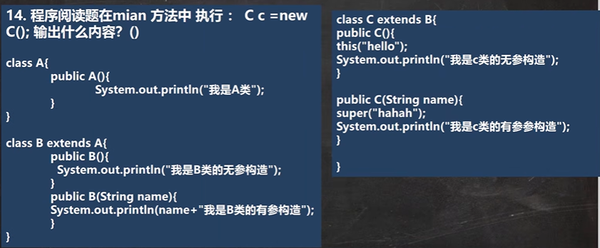 class C extends B{public C(){this("Hello");System.out.println("我是c类的无参构造");}public C(String name){super("hahah");System.out.println("我是C类的有参构造");}