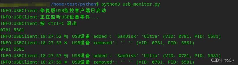logger = logging.getLogger('USBClient')dist_vidpid = {}class USBMonitorClient:def __init__(self):dbus.mainloop.glib.DBusGMainLoop(set_as_default=True)self.bus = dbus.SystemBus()self.connected_devices = {}def listen_for_events(self):try:self.bus.add_signal_receiver(self.on_device_changed,dbus_interface='com.Monitor.USBMonitor',signal_name='DeviceChanged')logger.info("正在监听USB设备事件...")logger.info("按 Ctrl+C 退出")loop = GLib.MainLoop()loop.run()except KeyboardInterrupt:logger.info("客户端已停止")except Exception as e:logger.error(f"客户端错误: {e}")def get_device_vid_pid(self, device_path):try:cmd = f"udevadm info {device_path}"with os.popen(cmd) as pipe:result = pipe.read()if result:vid = '未知'pid = '未知'for line in result.split('\n'):if line.startswith('E: ID_VENDOR_ID='):vid = line.split('=')[1]elif line.startswith('E: ID_MODEL_ID='):pid = line.split('=')[1]print(vid, pid)return vid, pidelse:logger.warning("udevadm命令执行失败,无返回结果")return '未知', '未知'except Exception as e:logger.error(f"获取设备VID/PID失败: {e}")return '未知', '未知'def on_device_changed(self, action, vendor_product, device_path, vendor_name, product_name):clean_action = action.strip("'\"")#传过来的action带了单引号vid = '未知'pid = '未知'timestamp = datetime.now().strftime("%H:%M:%S")status_icon = "🔌" if clean_action == "added" else "❌"if clean_action == "added":vid, pid = self.get_device_vid_pid(device_path)dist_vidpid[device_path] = vid + ":" + pidelse:vidpid = dist_vidpid[device_path].split(':')vid = vidpid[0]pid = vidpid[1]if vid != '未知' and pid != '未知':logger.info(f"{timestamp} {status_icon} USB设备{action}: {vendor_name} {product_name} (VID: {vid}, PID: {pid})")else:logger.info(f"{timestamp} {status_icon} USB设备{action}: {vendor_name} {product_name} (路径: {device_path})")if __name__ == "__main__":client = USBMonitorClient()client.listen_for_events()