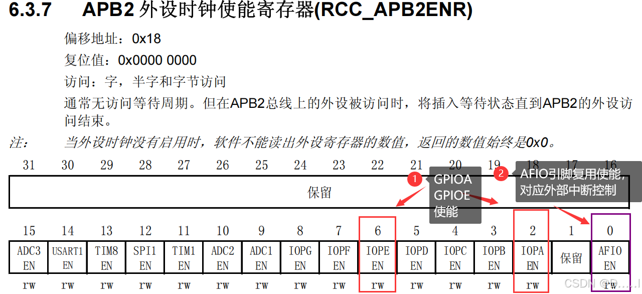 - 对应时钟配置寄存器是 APB2ENR 位2 IOA 位6 IOE