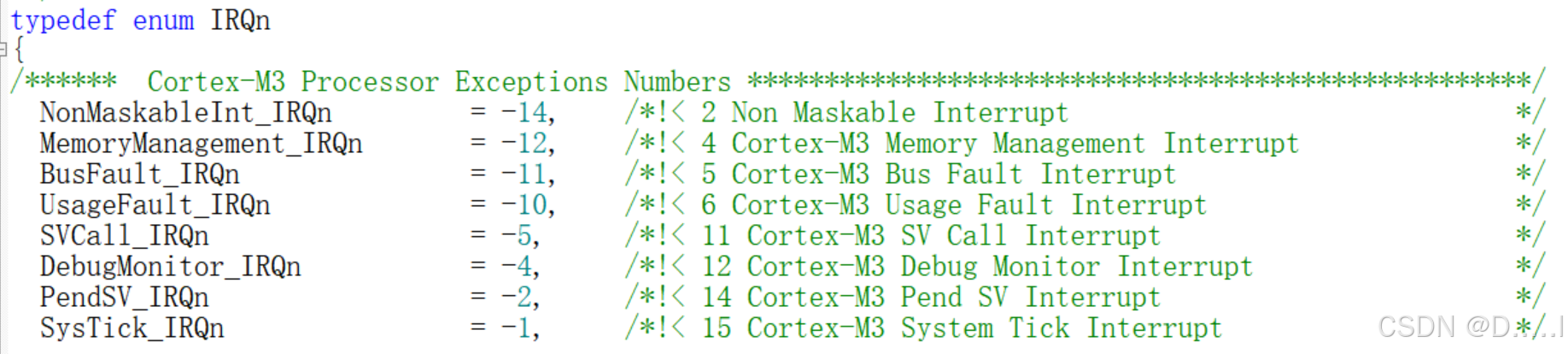 内部中断对应 IRQn,根据原码分析,缺少 RESET 和 HardFault 对应的 IRQn,是因为RESET 和 HardFault 对应的中断处理方式为硬件处理方式,与软件内容无关。