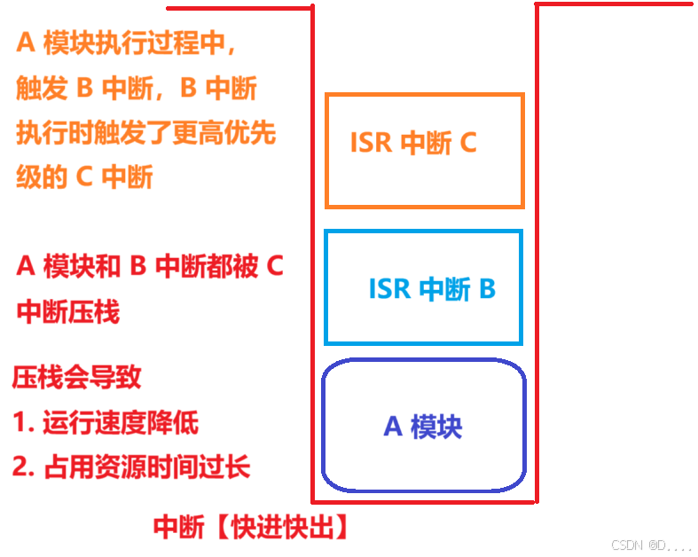 - 占先优先级,多个中断触发时,MCU 首先根据占先优先级判断,哪一个优先级高,其他中断进入等待等待状态。【占先优先级谁高谁执行】