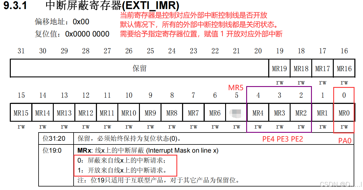 外部中断屏蔽寄存器是用于控制对应外部中断线,是否运行被 MCU 处理。如果需要使用对应的外部中断控制,必须开启中断允许。