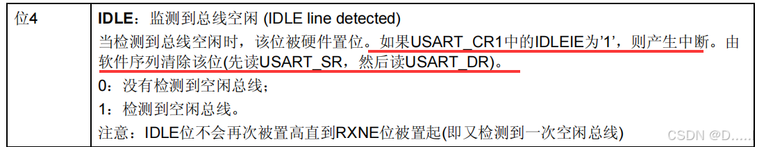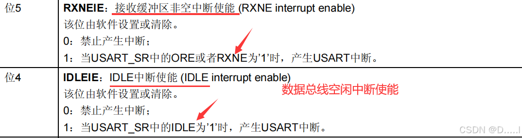 {/*当前 USART1 的控制寄存器中,打开 IDLEIE 数据总线空闲中断使能打开 RXNEIE 数据总线空闲中断使能*/USART1->CR1 |= (0x01 << 4) | (0x01 << 5);/*设置当前 USART1 对应的中断优先级为 0001 在全局优先级设置为 2 的情况下 占先 0 次级 1*/NVIC_SetPriority(USART1_IRQn, 1); // 0001 占先 0 次级 1/*告知当前 MCU 使能对应的 USART1_IRQn 中断*/NVIC_EnableIRQ(USART1_IRQn);