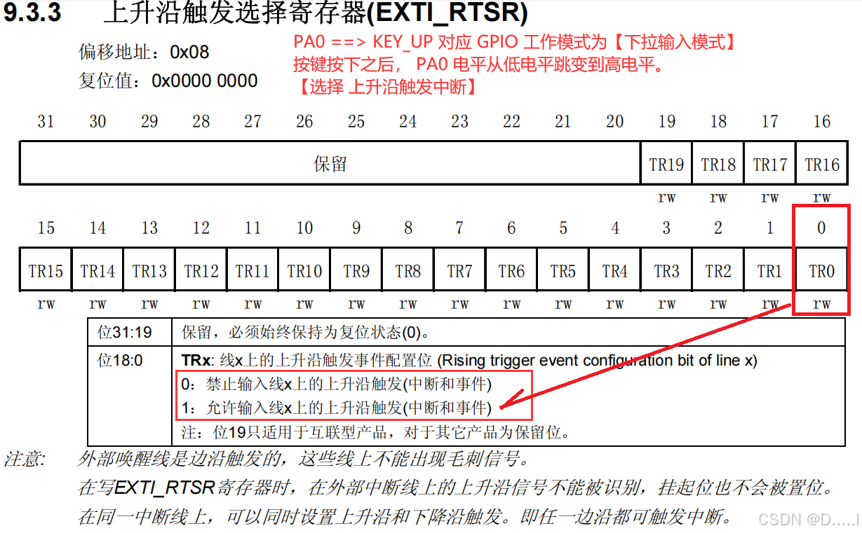 - EXTI_RTSR 控制对应外部中断控制线触发方式为 上升沿触发