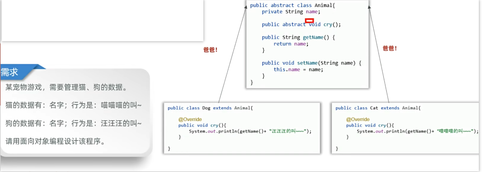 public abstract class Animal {//动物的叫声,因为每个动物的叫声都不同,所以抽象方法。//好处一:简化方法体。public abstract void cry();