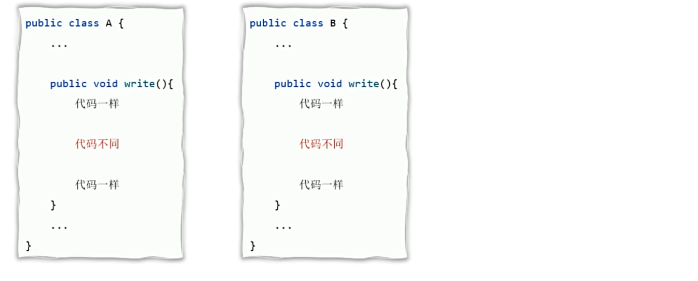 public class Student {public void write(){System.out.println("第一段相同");System.out.println("学生的第二段");System.out.println("第三段相同");}