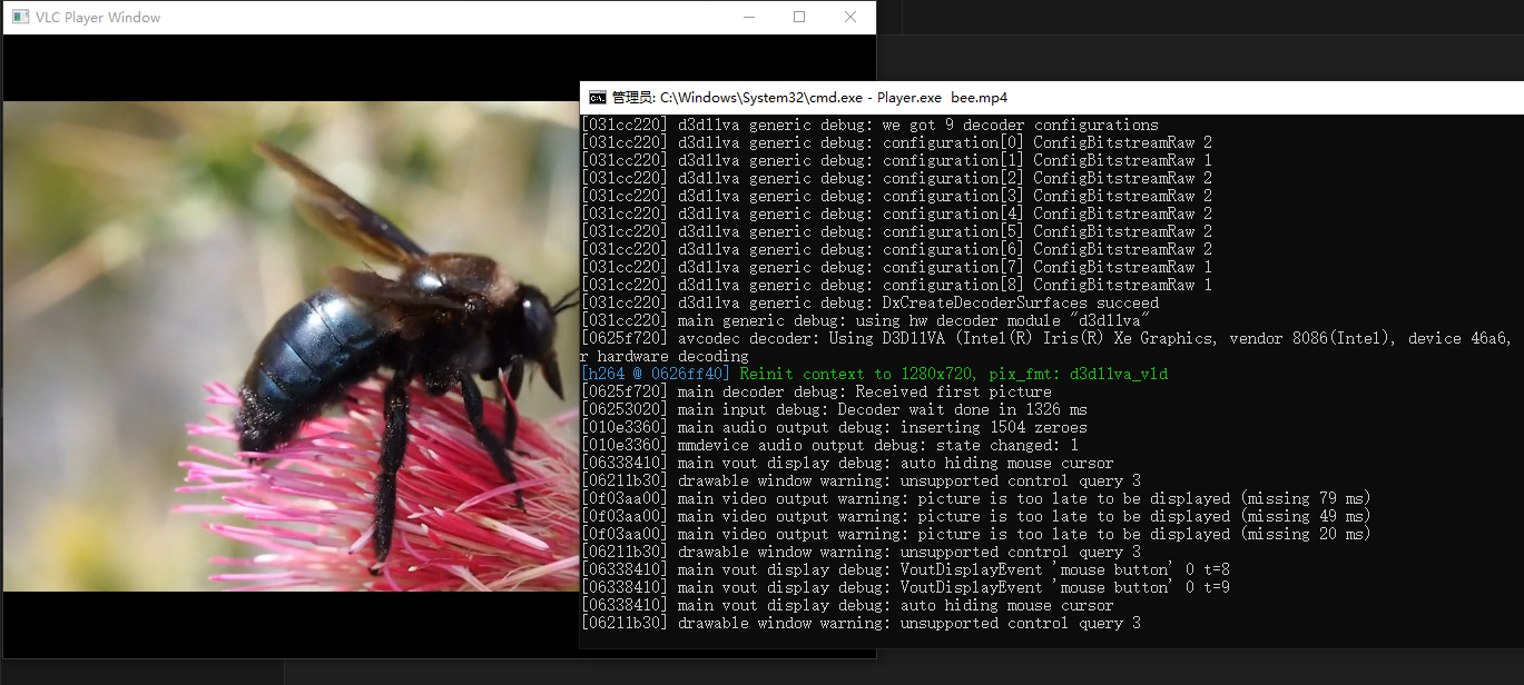 还需要把播放器中的 plugins 目录也拷贝过来,运行的时候也依赖这些,然后 Player.exe bee.mp4 就可以播放视频了