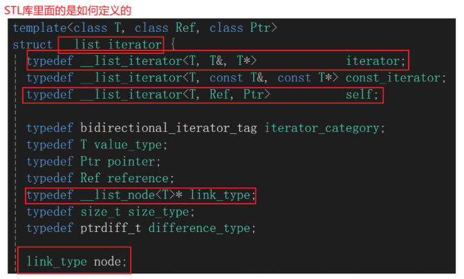 typedef __list_iterator<T, const T&, const T*> const_iterator;那Ref对应的就是引用类型,Ptr对应的是指针类型。