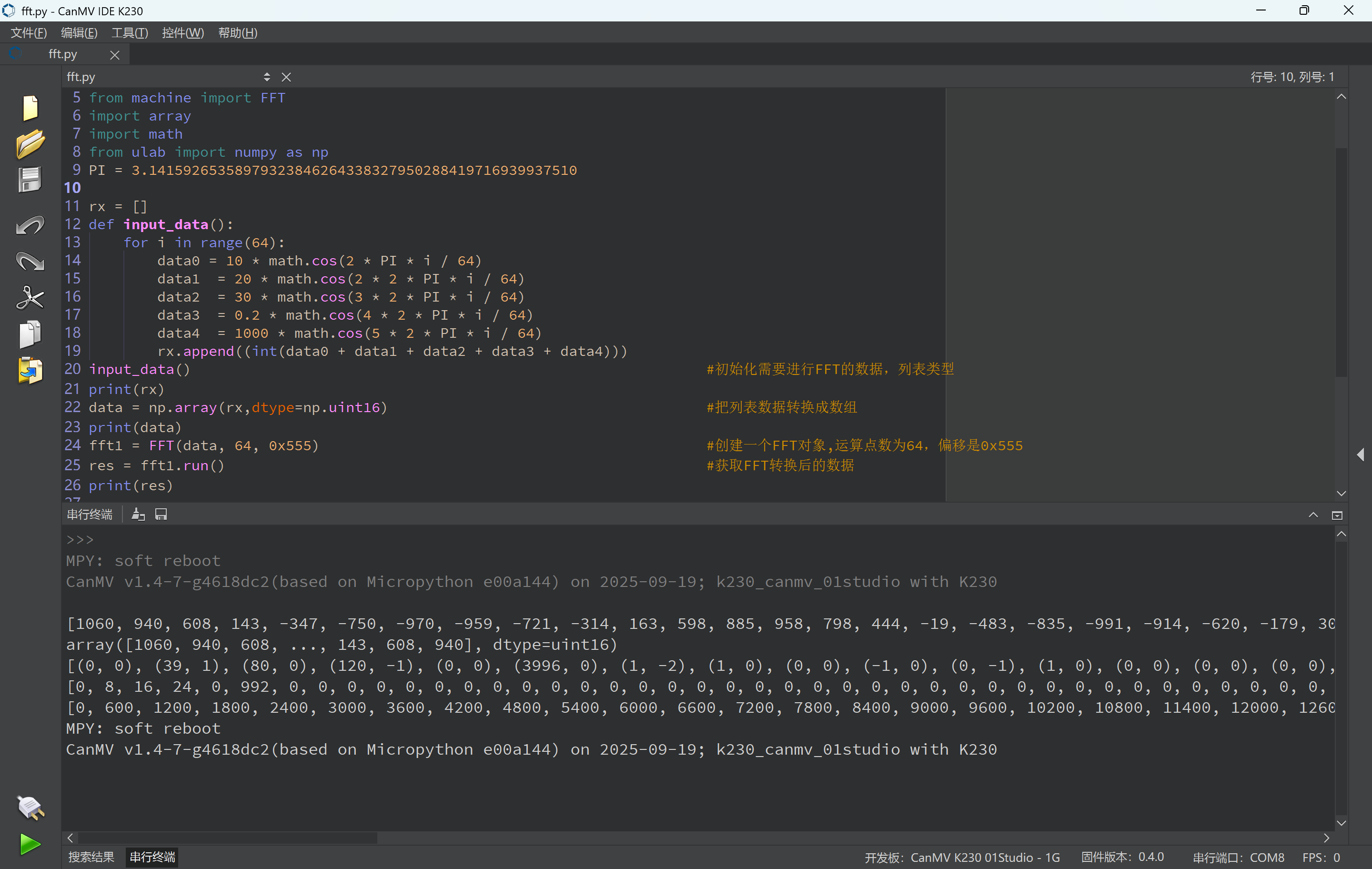 # 欢迎使用CanMV IDE, 点击IDE左下角的绿色按钮开始执行脚本from machine import FFT