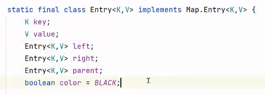 left、right:左、右子节点引用,是二叉树的基本结构;parent:父节点引用,用于红黑树旋转、调整时快速定位父节点;color:节点颜色(boolean color = BLACK,默认黑色),这是红黑树的标志性属性(红黑树节点只有红、黑两种颜色,用于维持树的平衡)。
